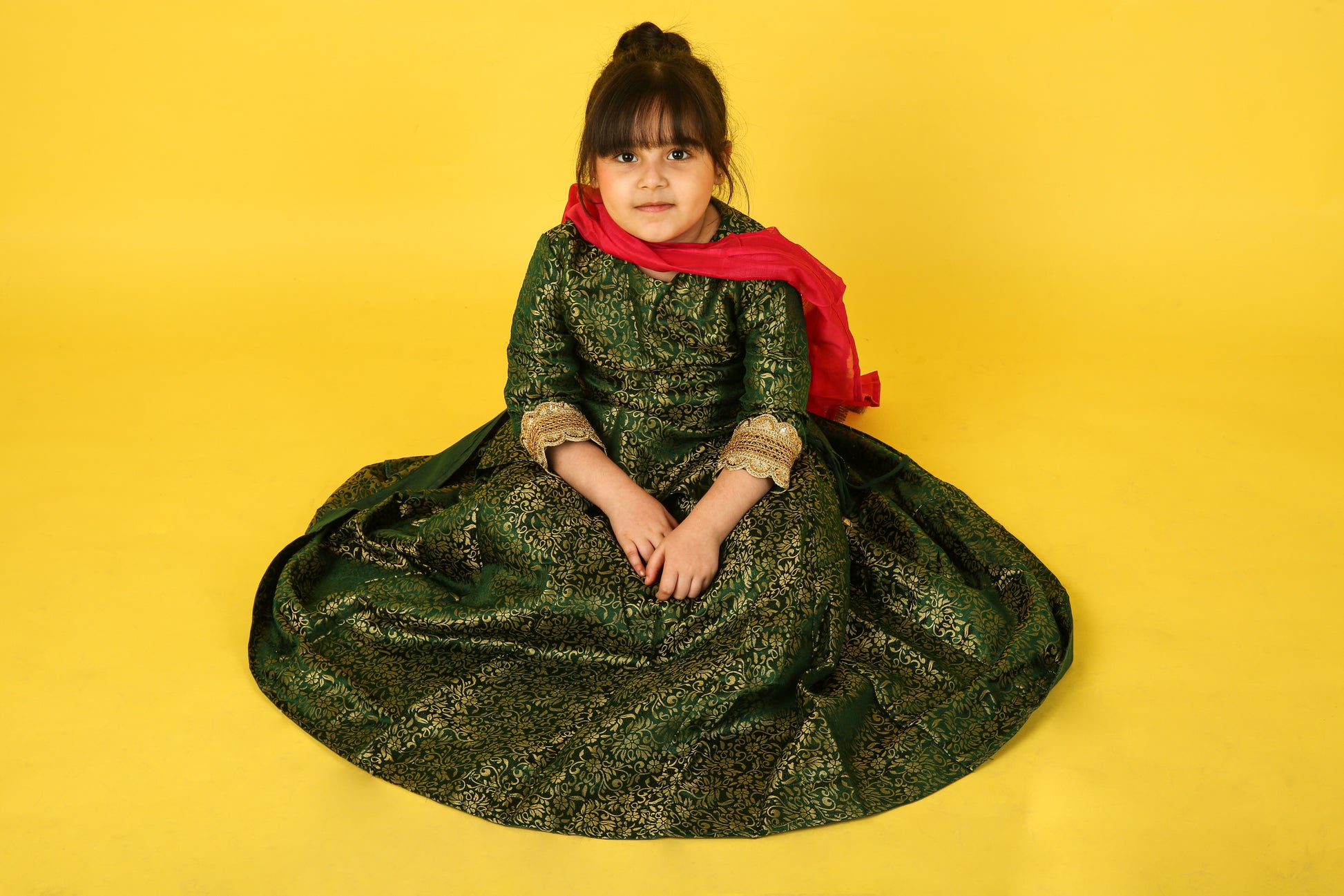 Green Banarsi Kurti Lahenga with Pink Shiffon Dupatta