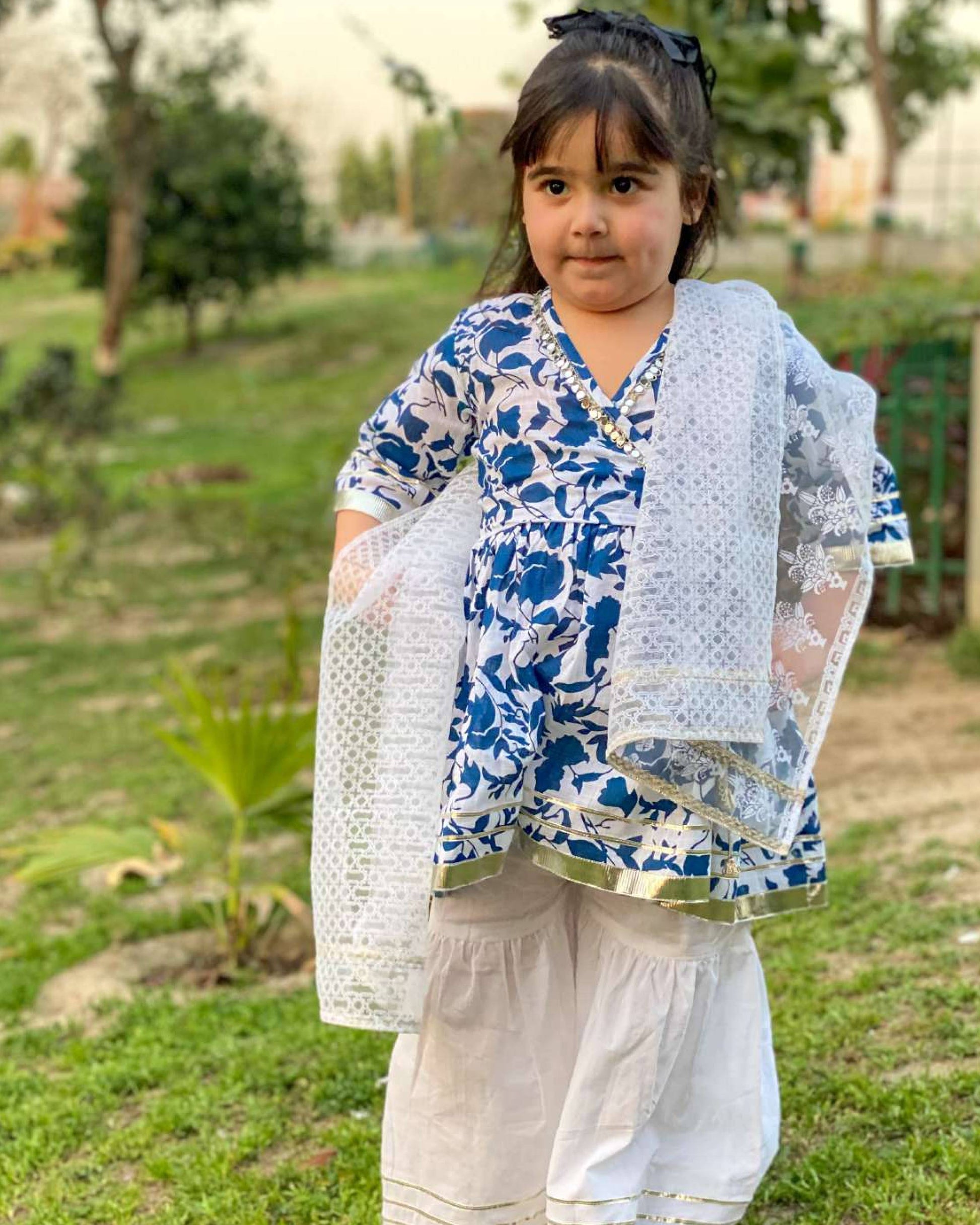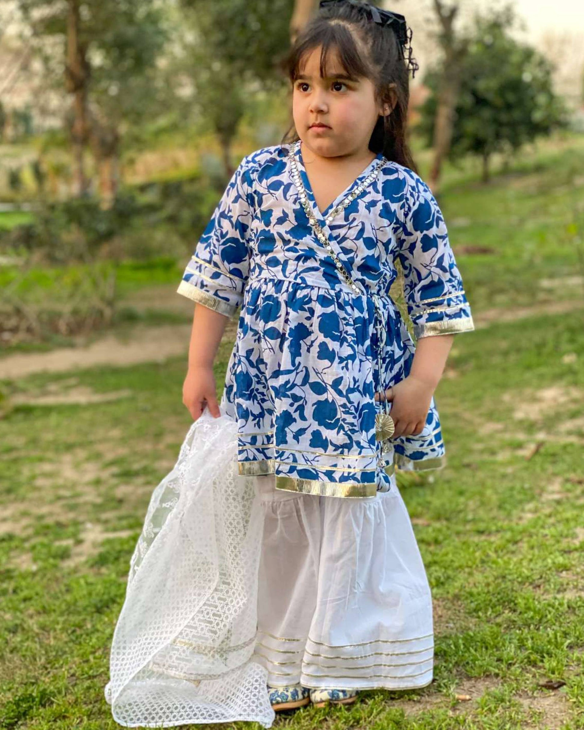 Blue mirror work Angrakha Gharara Set with Organza Dupatta